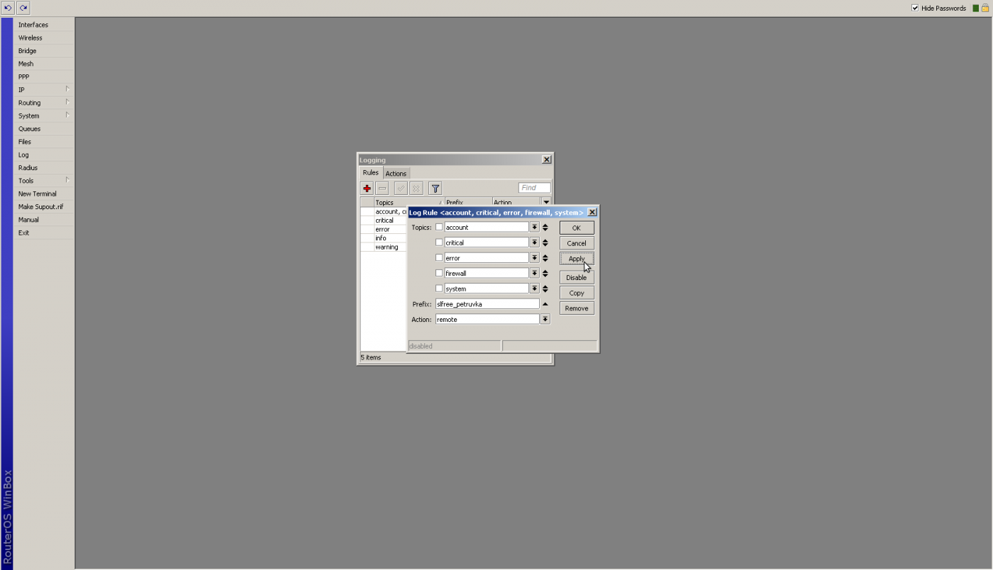 Už jenom zbývá přidat logovací pravidlo. Chceme logovat account, critical, error, firewall a system, pro přehlednost logů nastavíme prefix AP, akce je naše remote z bodu 13.