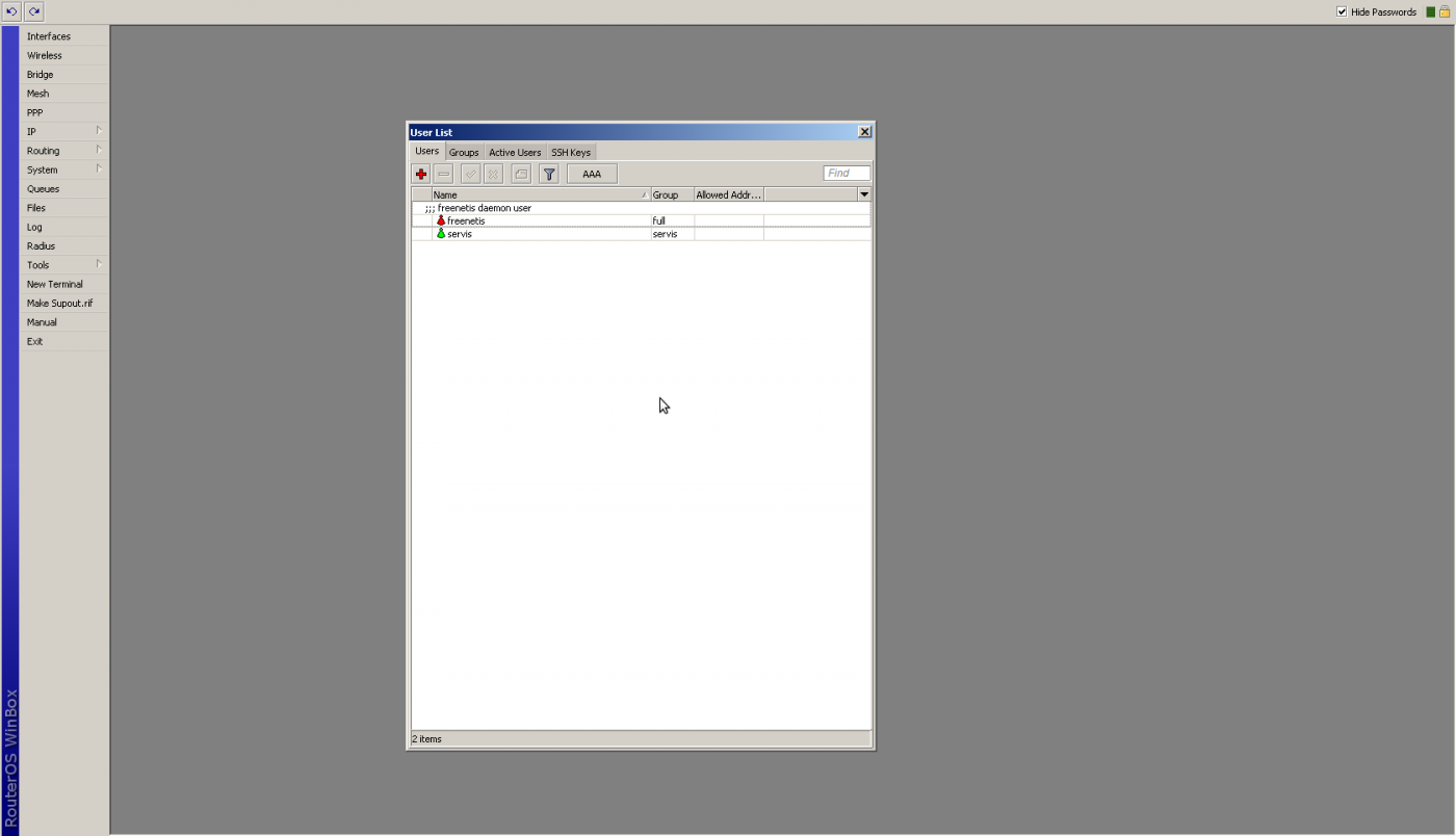 Tato sekce popisuje nastavení uživatelsků, které se nachází v okně Users. To je v některých verzích mikrotiku dostupné přímo v levém menu pod stejnojmennou položkou, v některých verzích je v submenu System.