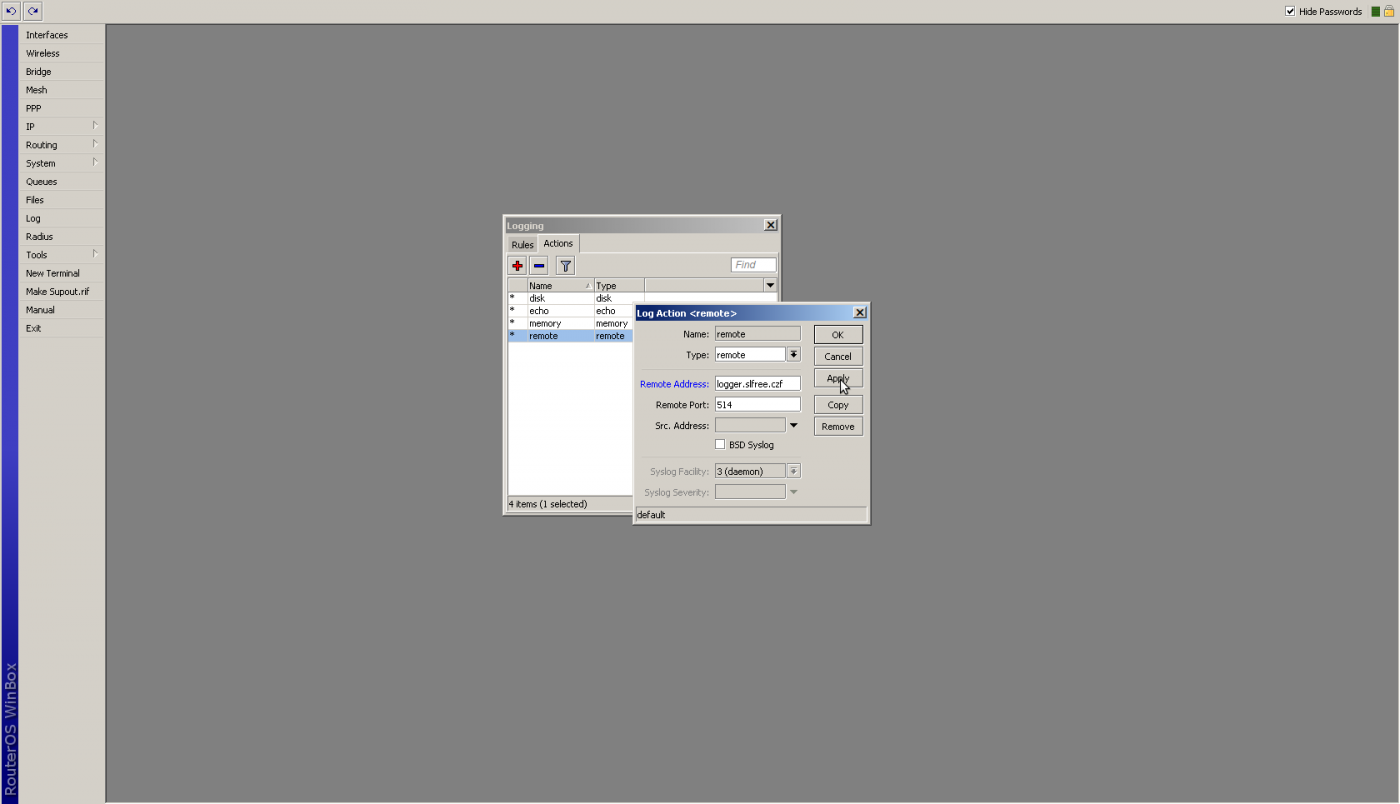Nejdříve bude potřeba vytvořit logovací akci pro typ remote (vzdálený). Defaultně jedna stejnojmenná již existuje, takže je ji potřeba pouze přenastavit pro naše účely. Port zůstává 514, adresu můžeme nastavit na logger.slfree.czf.