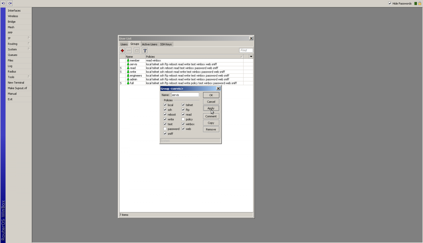 user group add name="servis" policy=local,telnet,ssh,ftp,reboot,read,write,test,winbox,web,sniff,!policy,!password