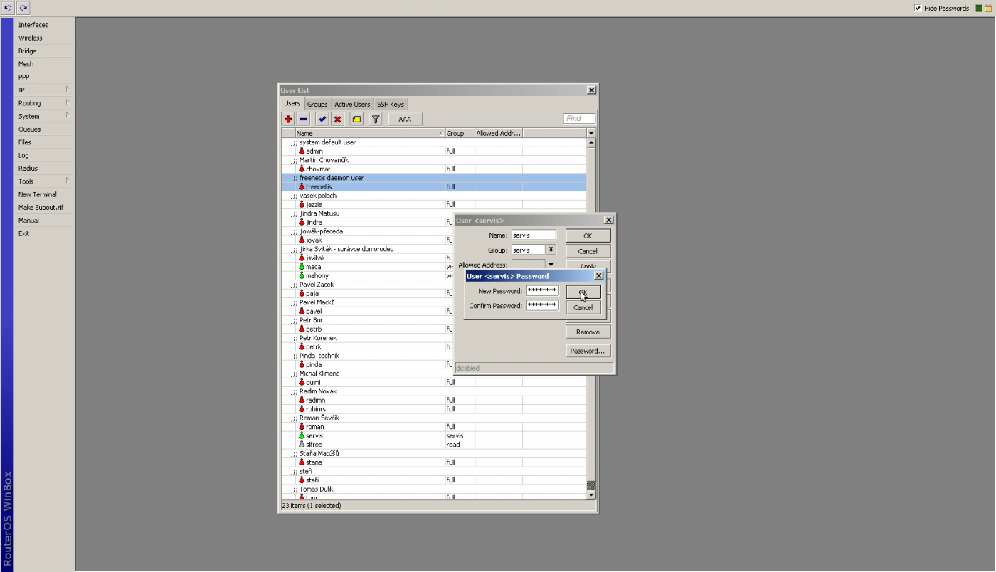 Uživatel servis slouží pro servis v případě výpadku radiusu. Jeho heslo je stejně jako u uživatele freenetis náhodně generované, avšak pro všechny AP je stejné.