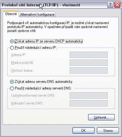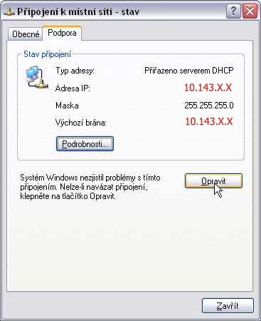pokud jsou problémy s DHCP serverem a IP adresa je ve špatném formátu, můžeme zkusit dát IP adresu "napevno" : v kartě Připojení k místní síti klikneme na vlastnosti a tam vybereme ikonu "Protokol sítě internet (TCP/IP"