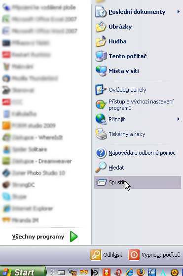Takže Start - spustit. ( místo tohoto klikání slouží klávesová zkratka Win+R - Win je ta klávesa s logem Microsoftu Windows - obvykle druhá klávesa zleva ve spodní řadě)