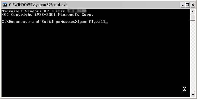 napíšeme tam cmd(pokud to tam už neni), objeví se černé okno: do něj napíšeme příkaz ipconfig/all