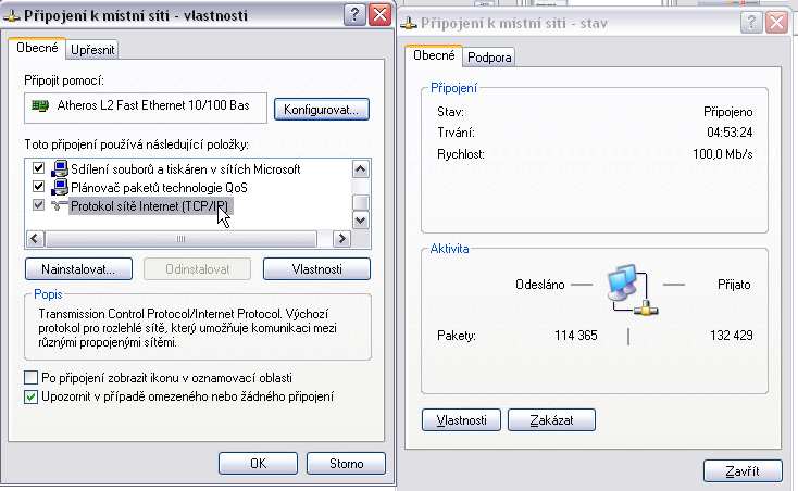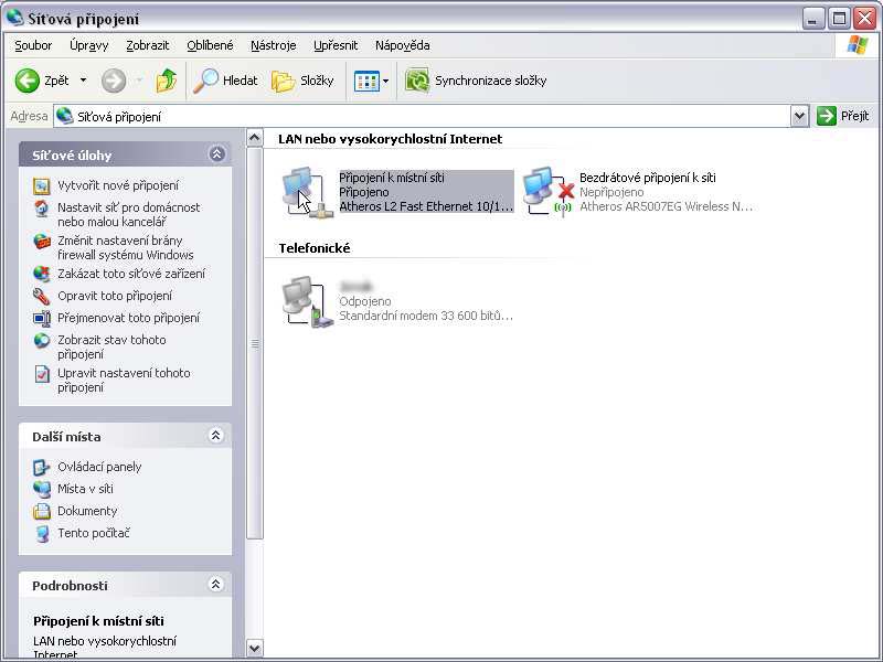 pokud kabelem, tak jako v našem případě je to ta první ikona s popiskem síťové karty (v našem případě Atheros L2...) Prostě většinou ty ostatní ikony jsou s červeným křížkem a popisem "Nepřipojeno", nebo s popiskem "Odpojeno" Pokud není Aktivní žádná ikona, znamená to buď zakázanou síťovku (pokud chceme povolit, tak levým myšítkem klikneme na ikonu a zvolíme Povolit), nebo něaký další problém se síťovou kartou.